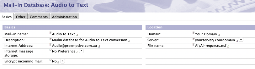 Audio intelligence receives incoming MP3 or WAV files via email and creates a request, which Preemptive AI then processes and responds to. The following steps walk you through how to mail-enable the database. This is standard Domino functionality. In this example, we are going to use the email address audio@preemptive.com.au and associate it with our Preemptive AI requests database. Adjust all settings to match your environment.