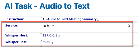 Audio intelligence is implemented as a number of Tasks in the AI-Proxy database, you need to update these tasks to tell it where to find Whisper and also what LLM server it should use to process requests.