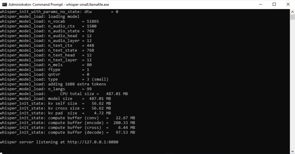 - Run the file, Whisper will now start and be listening on the 127.0.0.1 address.