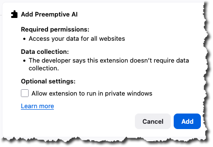 - Drag the AI-Firefox-X.X.X.xpi file to the browser window. A popup should appear.